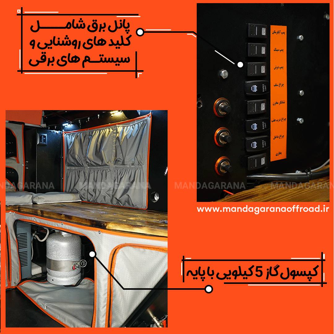 - جیب های لوازم داخل و درب عقب و سقف چادر